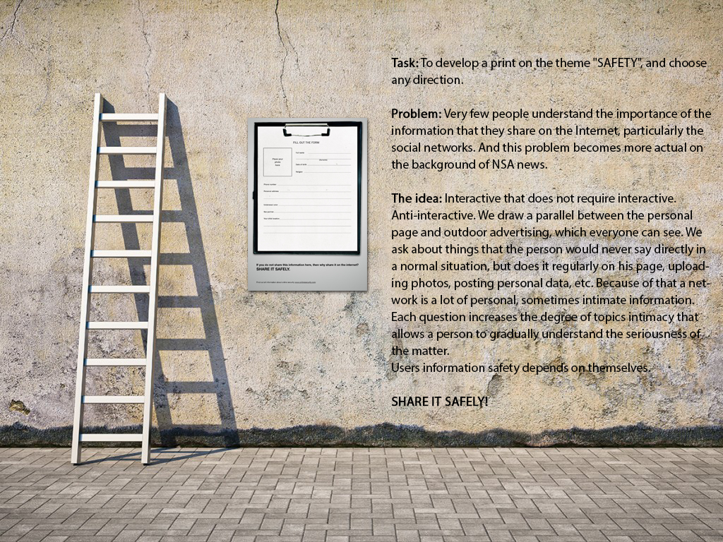 27 сентября в рамках церемонии награждения победителей Московского Международного фестиваля рекламы RED APPLE 2013 стали известны победители конкурса "Молодые креаторы", традиционно организуемого при поддержке фонда им. Юрия Заполь. Ими стали Илья Зорин и Никита Литвиненко (г.Екатерингбург) с работой "Share it safely". Теперь ребята представят Россию в категории Print на конкурсе YOUNG LIONS, который пройдет в рамках самого престижного фестиваля реклама в мире - Cannes Lions 2014.